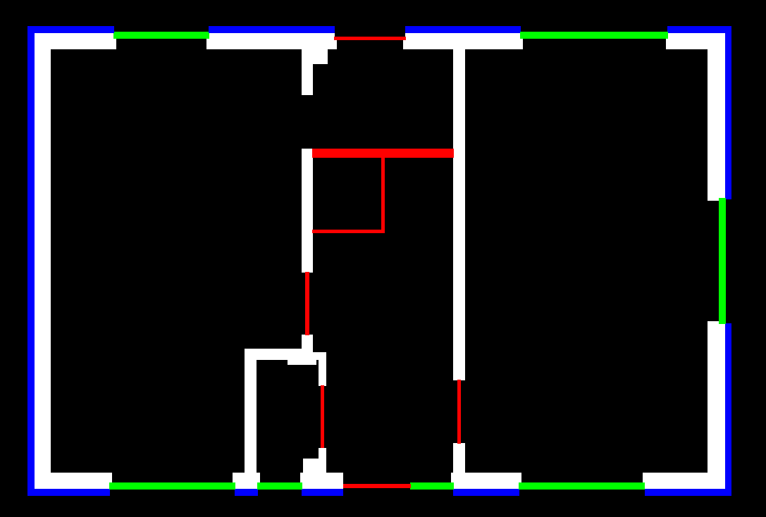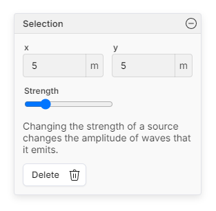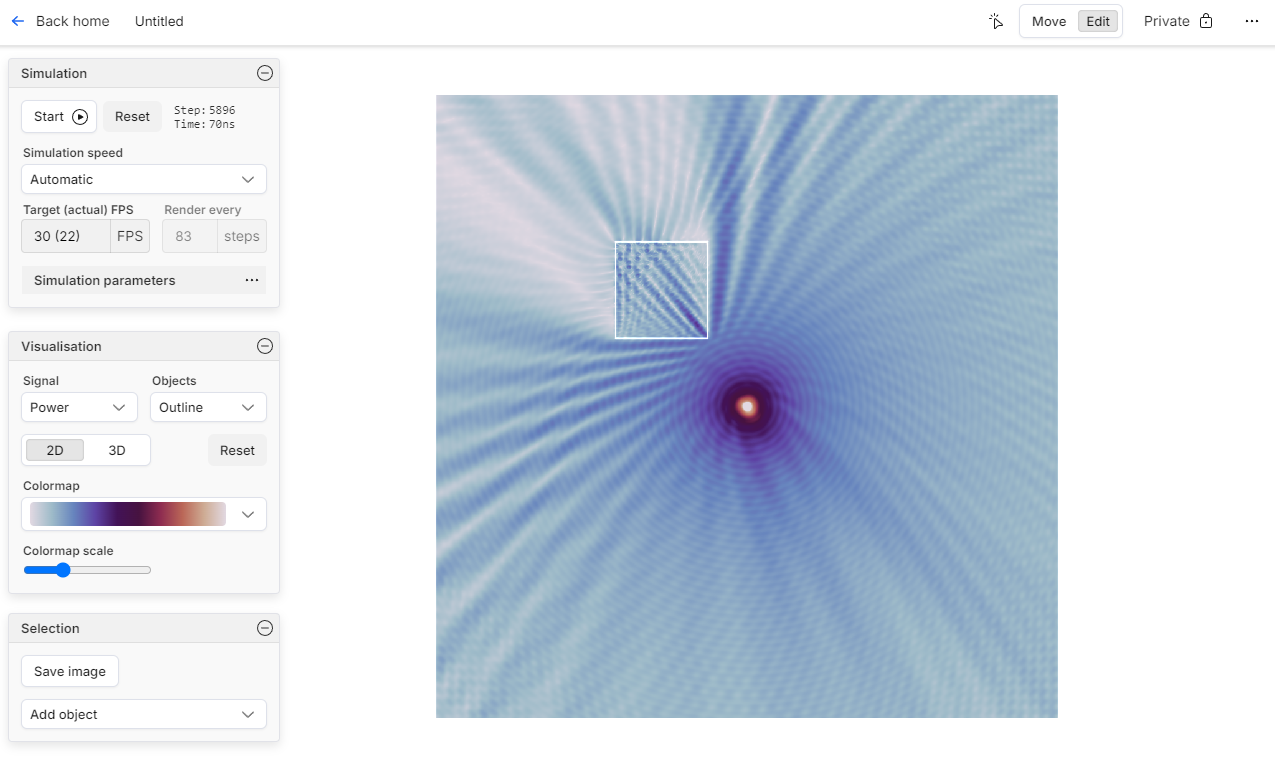A simulation is a 2D rectangular region containing a number of **objects** and **sources**. When the simulation is running, WiFi waves are emitted from sources, and move around the simulation. When waves encounter an object, they are reflected, refracted and absorbed realistically. When waves reach the edge of the simulation domain, they leave and don't return.