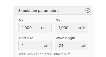 * **Nx/Ny** - the number of simulation grid cells in the x/y directions. Increasing these values allows simulating a larger area, but at the cost of increased simulation times.