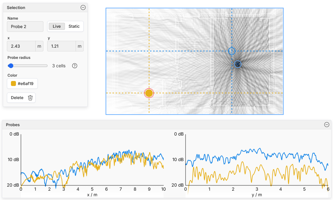 Probes are points in space that record signal strength along horizontal and vertical axes. Use probes to compare signals at different points or times: